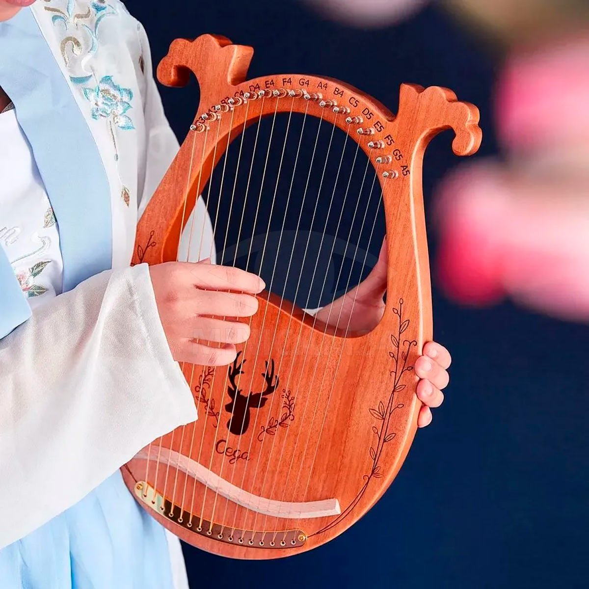 16-струнная лировая арфа с деревянным резонансным корпусом и прочными стальными струнами делает звук насыщенным и приятным.