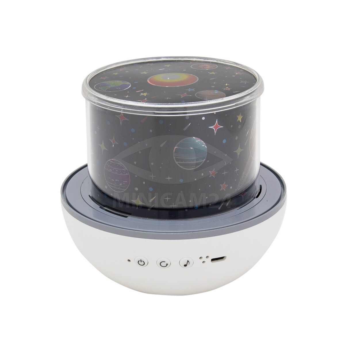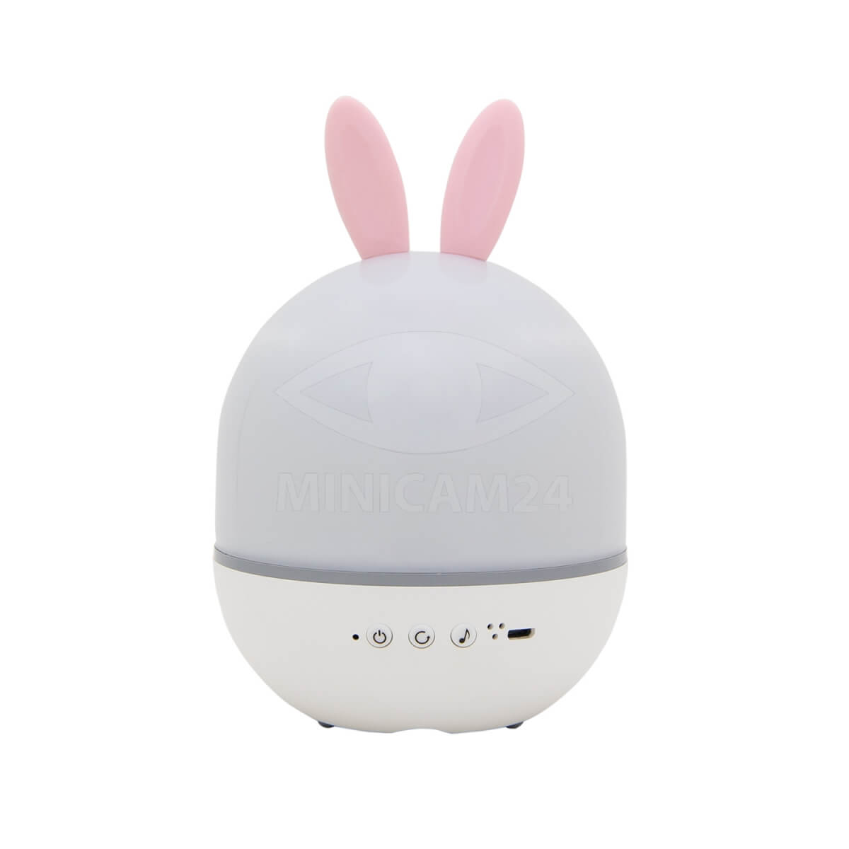 Светильник-ночник детский Bunny – компактный проектор звездного неба, стилизованный под зайца. Устройство проецирует на потолок и стены множество звезд и планет, создавая в комнате уютную расслабляющую атмосферу. Предусмотрено 4 режима работы: теплый свет, холодный, попеременное свечение нескольких секций диодов и одновременное свечение всех ламп. Если на светильник надеть специальный купол, девайс можно использовать как ночник. В качестве элементов управления выступают кнопки на передней панели. Питается устройство через USB разъем. Девайс имеет компактные размеры, легко поместится на прикроватном столике.