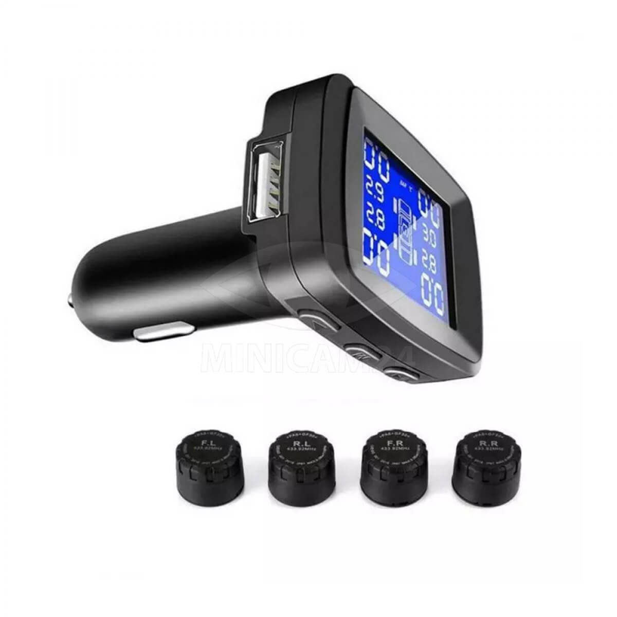 Бесконтактная система контроля давления в шинах. Результаты замеров выводятся на монитор приемника, который располагается в салоне авто. Предусмотрено 4 наружных датчика, которые монтируются на ниппель каждого колеса. При фиксации нестабильных показателей устройство издает предупреждающий сигнал. Прибор оснащен 1,8-дюймовым цифровым ЖК-экраном, питание осуществляется от прикуривателя. Система запускается автоматически во время начала движения.